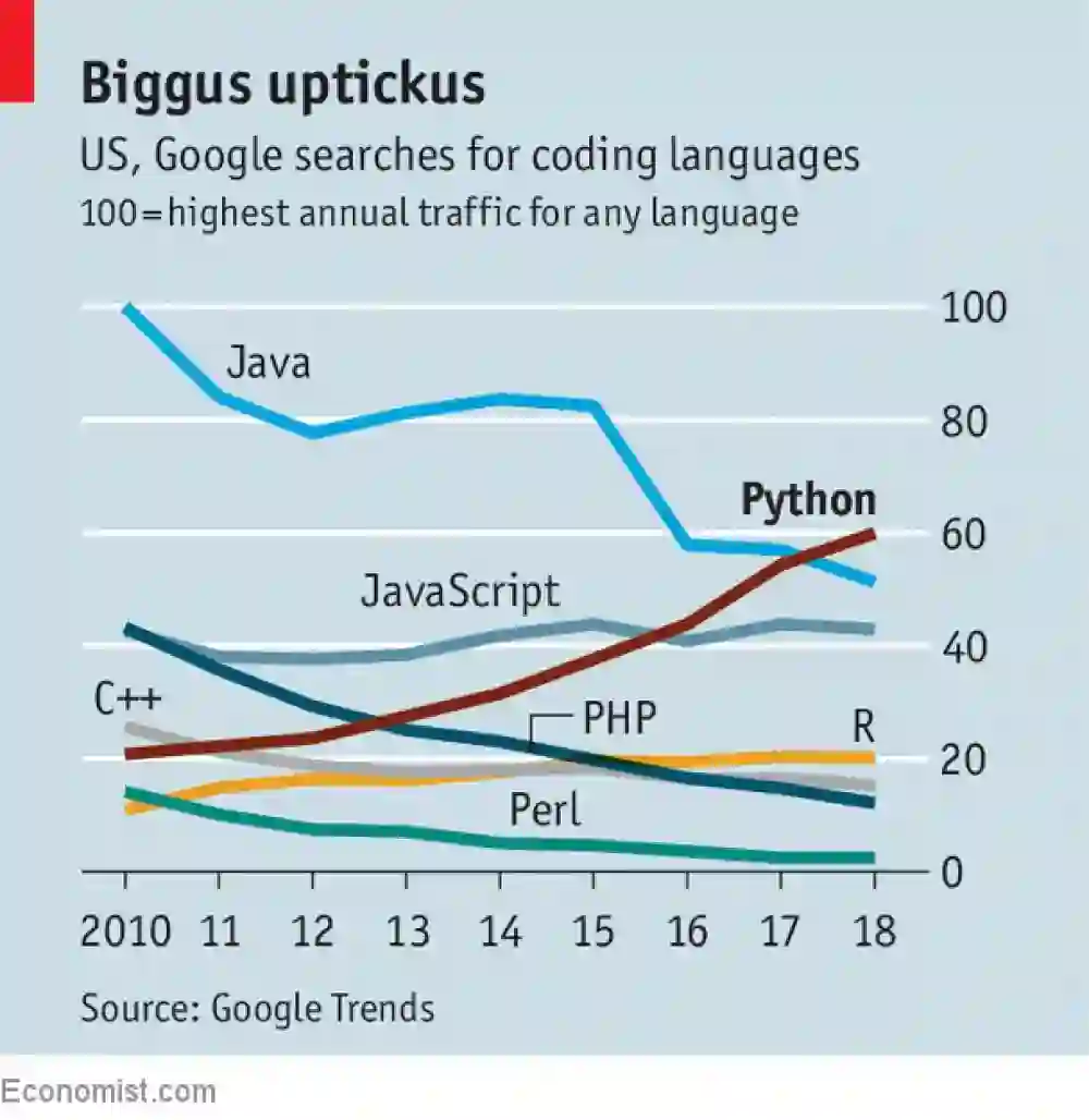在他的圣诞发明近30年后,Van Rossum先生就像技术版的“飞行马戏团”(Monty Python)角色一样,在电影《布莱恩的一生》中意外地成为弥赛亚。他解释说:“我并没有打算创造一种旨在大规模使用的语言。”但在过去的12个月里,美国用户在谷歌上搜索Python的频率要高于真人秀明星金·卡戴珊。自2010年以来,用户对Python的查询率增加了两倍,对其他编程语言的查询则持平或下降(见下表)。