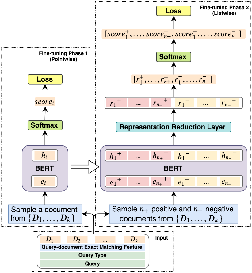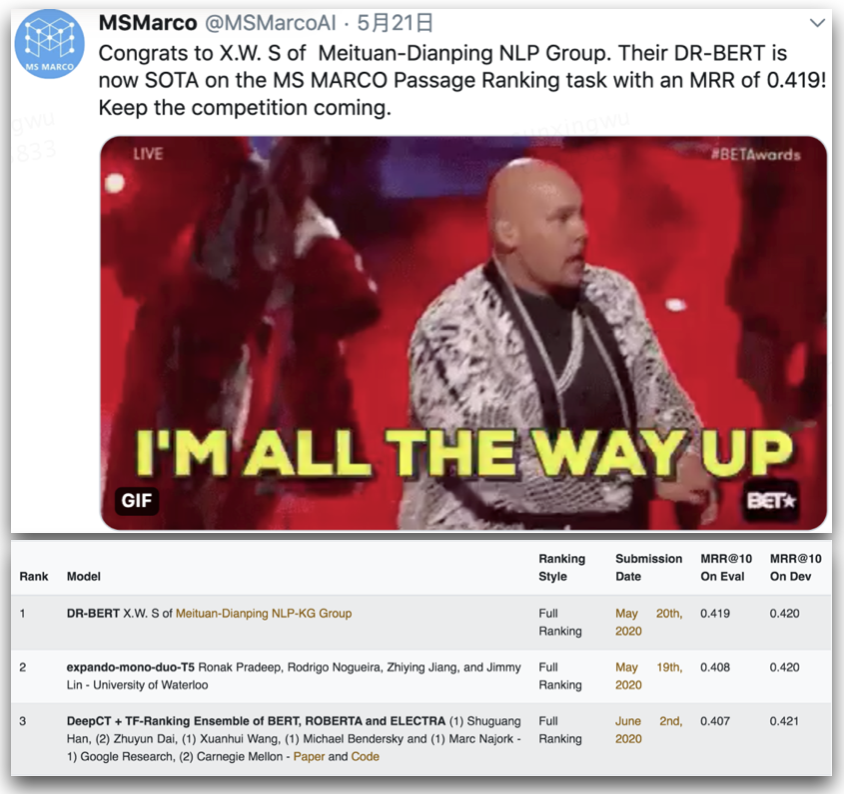 背景提高机器阅读理解(MRC)能力以及开放领域问答(QA)能力是自然语言处理(NLP)领域的一大重要目标。在人工智能领域,很多突破性的进展都基于一些大型公开的数据集。比如在计算机视觉领域,基于对ImageNet数据集研发的物体分类模型已经超越了人类的表现。类似的,在语音识别领域,一些大型的语音数据库,同样使得了深度学习模型大幅提高了语音识别的能力。近年来,为了提高模型的自然语言理解能力,越来越多的MRC和QA数据集开始涌现。但是,这些数据集或多或少存在一些缺陷,比如数据量不够、依赖人工构造Query等。针对这些问题,微软提出了一个基于大规模真实场景数据的阅读理解数据集MS MARCO (Microsoft Machine Reading Comprehension)[1]。该数据集基于Bing搜索引擎和Cortana智能助手中的真实搜索查询产生,包含100万查询,800万文档和18万人工编辑的答案。基于MS MARCO数据集,微软提出了两种不同的任务:一种是给定问题,检索所有数据集中的文档并进行排序,属于文档检索和排序任务;另一种是根据问题和给定的相关文档生成答案,属于QA任务。在美团业务中,文档检索和排序算法在搜索、广告、推荐等场景中都有着广泛的应用。此外,直接在所有候选文档上进行QA任务的时间消耗是无法接受的,QA任务必须依靠排序任务筛选出排名靠前的文档,而排序算法的性能直接影响到QA任务的表现。基于上述原因,我们主要将精力放在基于MS MARCO的文档检索和排序任务上。自2018年10月MACRO文档排序任务发布后,迄今吸引了包括阿里巴巴达摩院、Facebook、微软、卡内基梅隆大学、清华等多家企业和高校的参与。在美团的预训练MT-BERT平台[14]上,我们提出了一种针对该文本检索任务的BERT算法方案,称之为DR-BERT(Enhancing BERT-based Document Ranking Model with Task-adaptive Training and OOV Matching Method)。DR-BERT是第一个在官方评测指标MRR@10上突破0.4的模型,且在2020年5月21日(模型提交日)-8月12日期间位居榜首,主办方也单独发表推文表示了祝贺,如下图1所示。DR-BERT模型的核心创新主要包括领域自适应的预训练、两阶段模型精调及两种OOV(Out of Vocabulary)匹配方法。图1 官方祝贺推文及MARCO 排行榜相关介绍Learning to Rank在信息检索领域,早期就已经存在很多机器学习排序模型(Learning to Rank)用来解决文档排序问题,包括LambdaRank[2]、AdaRank[3]等,这些模型依赖很多手工构造的特征。而随着深度学习技术在机器学习领域的流行,研究人员提出了很多神经排序模型,比如DSSM[4]、KNRM[5]等。这些模型将问题和文档的表示映射到连续的向量空间中,然后通过神经网络来计算它们的相似度,从而避免了繁琐的手工特征构建。图2 Pointwise、Pairwise、Listwise训练的目标根据学习目标的不同,排序模型大体可以分为Pointwise、Pairwise和Listwise。这三种方法的示意图如上图2所示。其中,Pointwise方法直接预测每个文档和问题的相关分数,尽管这种方法很容易实现,然而对于排序来说,更重要的是学到不同文档之间的排序关系。基于这种思想,Pairwise方法将排序问题转换为对两两文档的比较。具体来讲,给定一个问题,每个文档都会和其他的文档两两比较,判断该文档是否优于其他文档。这样的话,模型就学习到了不同文档之间的相对关系。然而,Pairwise的排序任务存在两个问题:第一,这种方法优化两两文档的比较而非更多文档的排序,跟文档排序的目标不同;第二,随机从文档中抽取Pair容易造成训练数据偏置的问题。为了弥补这些问题,Listwise方法将Pairwsie的思路加以延伸,直接学习排序之间的相互关系。根据使用的损失函数形式,研究人员提出了多种不同的Listwise模型。比如,ListNet[6]直接使用每个文档的top-1概率分布作为排序列表,并使用交叉熵损失来优化。ListMLE[7]使用最大似然来优化。SoftRank[8]直接使用NDCG这种排序的度量指标来进行优化。大多数研究表明,相比于Pointwise和Pairwise方法,Listwise的学习方式能够产生更好的排序结果。BERT自2018年谷歌的BERT[9]的提出以来,预训练语言模型在自然语言处理领域取得了很大的成功,在多种NLP任务上取得了SOTA效果。BERT本质上是一个基于Transformer架构的编码器,其取得成功的关键因素是利用多层Transoformer中的自注意力机制(Self-Attention)提取不同层次的语义特征,具有很强的语义表征能力。如图3所示,BERT的训练分为两部分,一部分是基于大规模语料上的预训练(Pre-training),一部分是在特定任务上的微调(Fine-tuning)。图3 BERT的结构和训练模式在信息检索领域,很多研究人员也开始使用BERT来完成排序任务。比如,[10][11]就使用BERT在MS MARCO上进行实验,得到的结果大幅超越了当时最好的神经网络排序模型。[10]使用了Pointwise学习方式,而[11]使用了Pairwise学习方式。这些工作虽然取得了不错的效果,但是未利用到排序本身的比较信息。基于此,我们结合BERT本身的语义表征能力和Listwise排序,取得了很大的进步。模型介绍任务描述