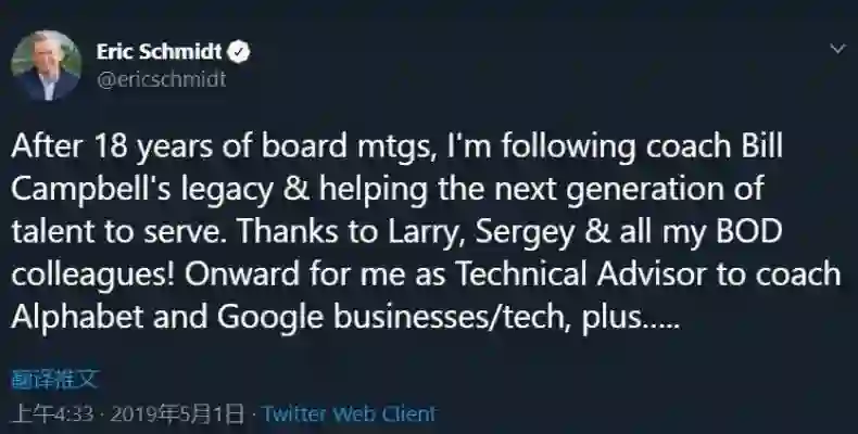 在 2018 年辞去董事会执行主席职位后,施密特已经转变成为公司「技术顾问」这样的模糊职位。施密特曾表示自己已将重点关注方向转向了机器学习和人工智能的新应用上。
