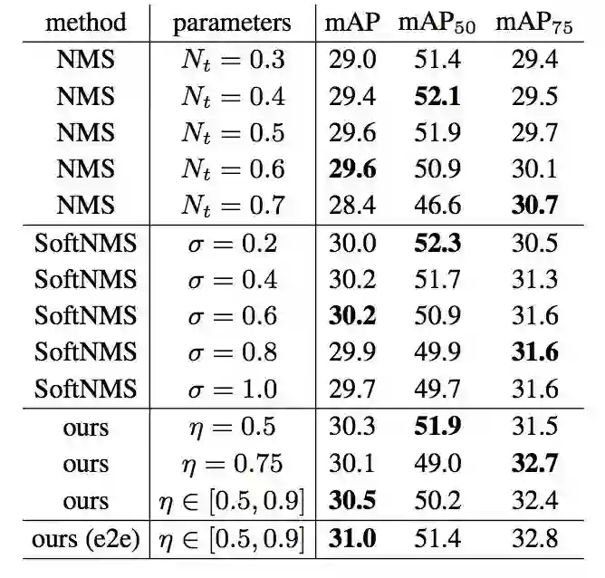 表 4. 重复检测框删除网络和 NMS/SoftNMS 进行了比较。采用端到端训练以后,检测性能进一步提升(30.5->31.0)。