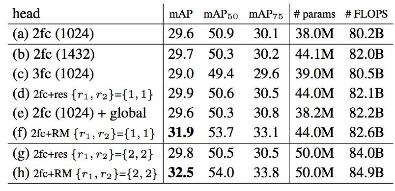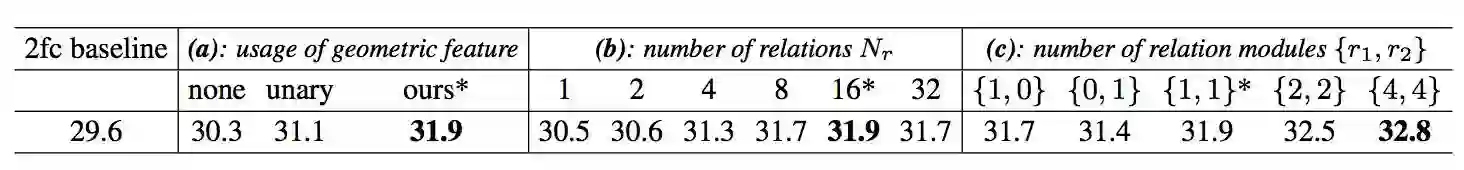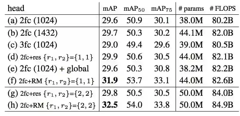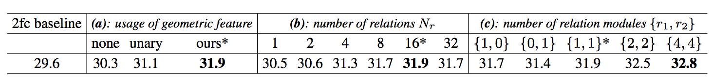 表 2. 比较不同的 head 在相同复杂度下的准确率。物体关系模块的提升不是由更多的参数和计算量来实现的(简单加深和加宽提升很小)。