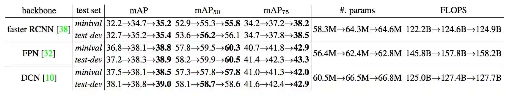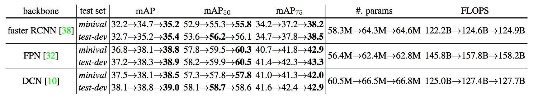 表 5. 从左到右依次是 2fc head+SoftNMS (baseline),2fc+RM head (应用物体关系模块到 2fc head) 和 2fc+RM head+端到端。基本网络是 ResNet101。训练过程中均采用了在线难样本挖掘(OHEM)。