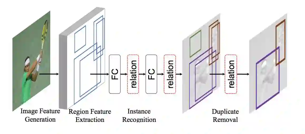 图 1. 目前最好的物体检测器基于一个四步法的流程。物体关系模块(红色虚线框)能很方便地嵌入这个流程,用于提升物体框识别和重复框删除这两个步骤,最终得到一个完全端到端的物体检测器。