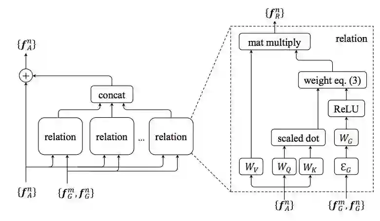 图 2. 左:物体关系模块;右:关系特征计算。f_A 表示输入的表观特征,f_G 表示输入的几何特征(4 维 bounding box),f_R 表示关系特征。该模块可以完全由现有深度学习框架中的基本操作来实现(例如 mxnet)。