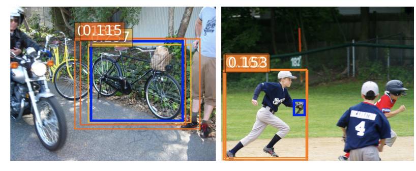 图 4. 高相关权重的检测框对(代表性例子)。蓝色框是被影响的参考框,橙色框表示对其有较大贡献的检测框(左上角的数字显示具体的相关权重)。左图显示重叠的框对中心的框产生大的影响;有图显示人对手套产生较大影响。