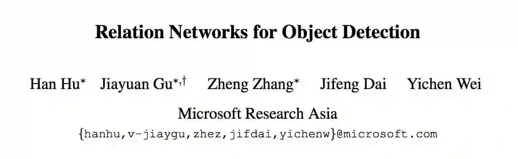 现有的物体检测算法均采用单独识别物体的方式,而没有利用物体之间的相互关系。近日,来自微软亚洲研究院视觉计算组的研究员们提出了物体关系模块(object relation module)。该模块通过建模物体间外观和几何的交互信息来首次实现了所有物体的联合推理学习。该模块可以用于提高物体识别的精度,也可以替代通常使用的非极大抑制(non-maximum suppression)后处理方法。在现今最好的物体检测框架下,利用该模块实现了首个完全端到端的物体检测系统。