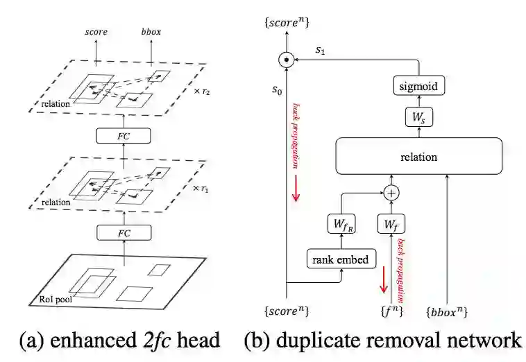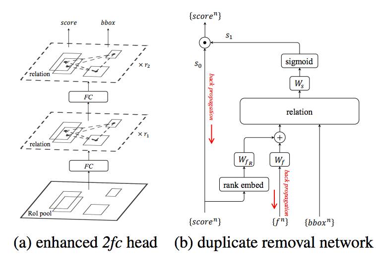 图 3. 将物体关系模块应用到 a) 物体框识别(增强的 2fc head)和 b)重复检测框删除网络。在端到端检测系统中,b) 中红色箭头部分的梯度将会回传。