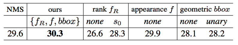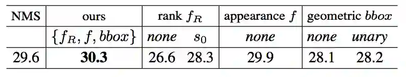 表 3. 应用到重复检测框删除(对应图 3a)的 ablation 实验(none 表示不用相关的特征)。