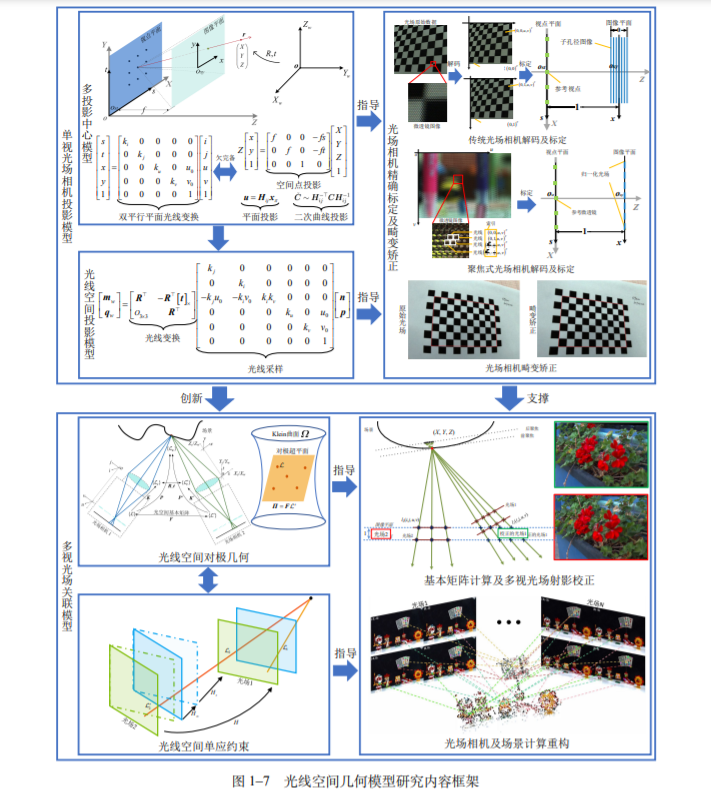 (2)提出了统一描述光场相机光线采样及变换的光线空间投影模型。从 Plücker 光 线出发,提出了 6 × 6 光线空间内参矩阵和投影矩阵,分别描述了光场相机光线采样和 变换过程。根据 Plücker 光线的数学定义,推导了其在 Klein 曲面的高维特性及光线空 间投影变换的不变性。基于光线空间投影矩阵,建立了空间点与光线间线性约束,提出 了光场相机标定方法,定义了异面光线间几何距离,并用于非线性优化。仿真与真实光 场数据的实验结果表明,光线空间投影模型可统一描述光线采样及变换过程,并精确标 定光场相机。
