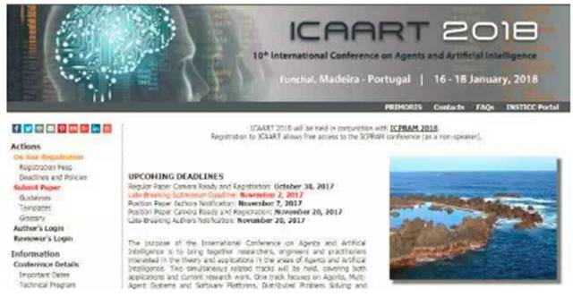下届 ICAART 会议将于 2018 年 16-18 日在葡萄牙 Funchal 举行。