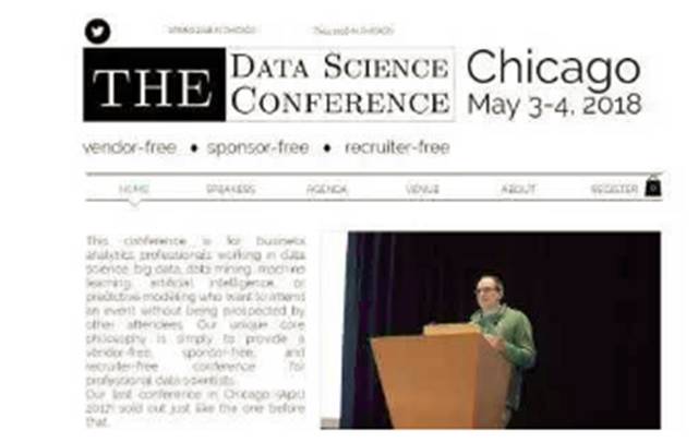 The Data Science Conference 是美国的机器学习和人工智能大会之一。其参会者主要是业务分析人员,此外还有数据科学家、预测分析员和机器学习专家。该会议的适合参会人群包括在大数据、数据挖掘、机器学习、人工智能和预测建模领域工作的人们。会议主题包括促进数据科学的教育和开源 vs 专用服务的利弊。