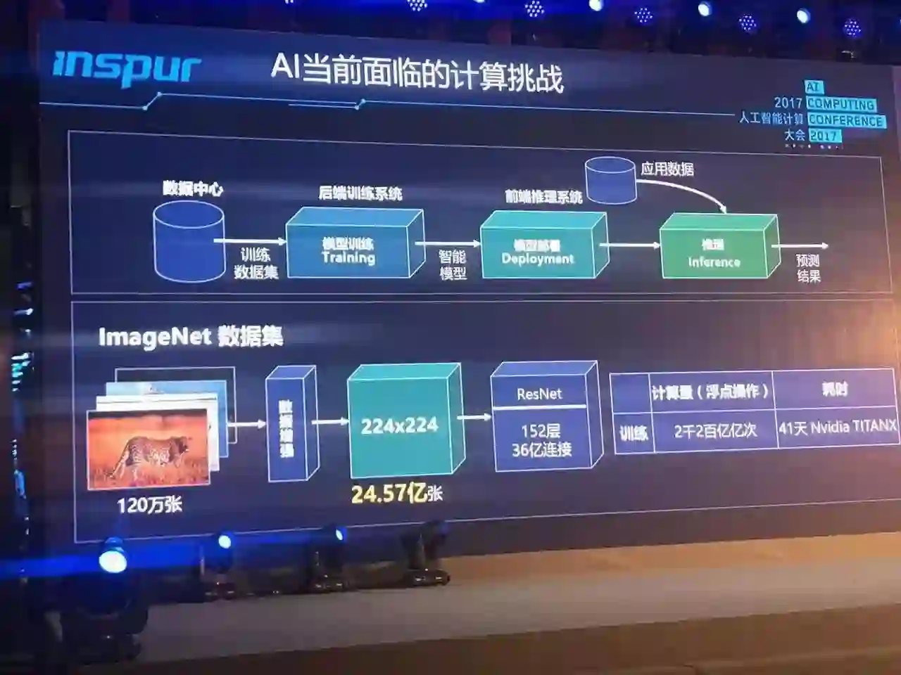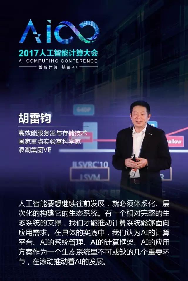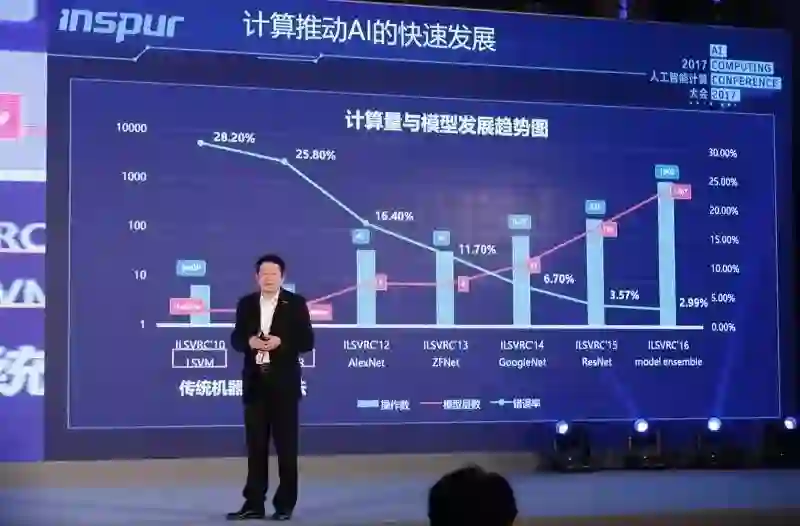 浪潮集团 VP 胡雷钧在演讲中提到,新的model对计算能力的需求由三个因素决定,一个是网络深度,一个是网络里节点单元的个数和节点单元连接的复杂度,一个是处理的数据集的规模。这三个因素加在一起使得我们训练这个模型需要的计算能力是非常大的,比如说用120万张图片的数据集来训练一个ResNet,需要的时间是41天,整个浮点运算操作的总量是2200亿亿次。