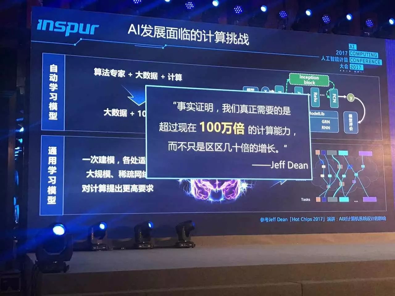 【新智元导读】人工智能三大支柱之一的计算目前发展是什么样的?它足以支撑人工智能的火速发展吗,会不会拖后腿,让人工智能的发展停滞?9月7日首届AI计算大会上述问题得到了很好的解答。在会上发表演讲的嘉宾首先对“计算力对新一波人工智能浪潮的影响有多大”进行了讨论。浪潮集团VP胡雷钧在主题演讲中对新的model对计算能力的需求三个因素进行了剖析,这里其中一个是网络深度,一个是网络里节点单元的个数和节点单元连接的复杂度,一个是处理的数据集的规模。