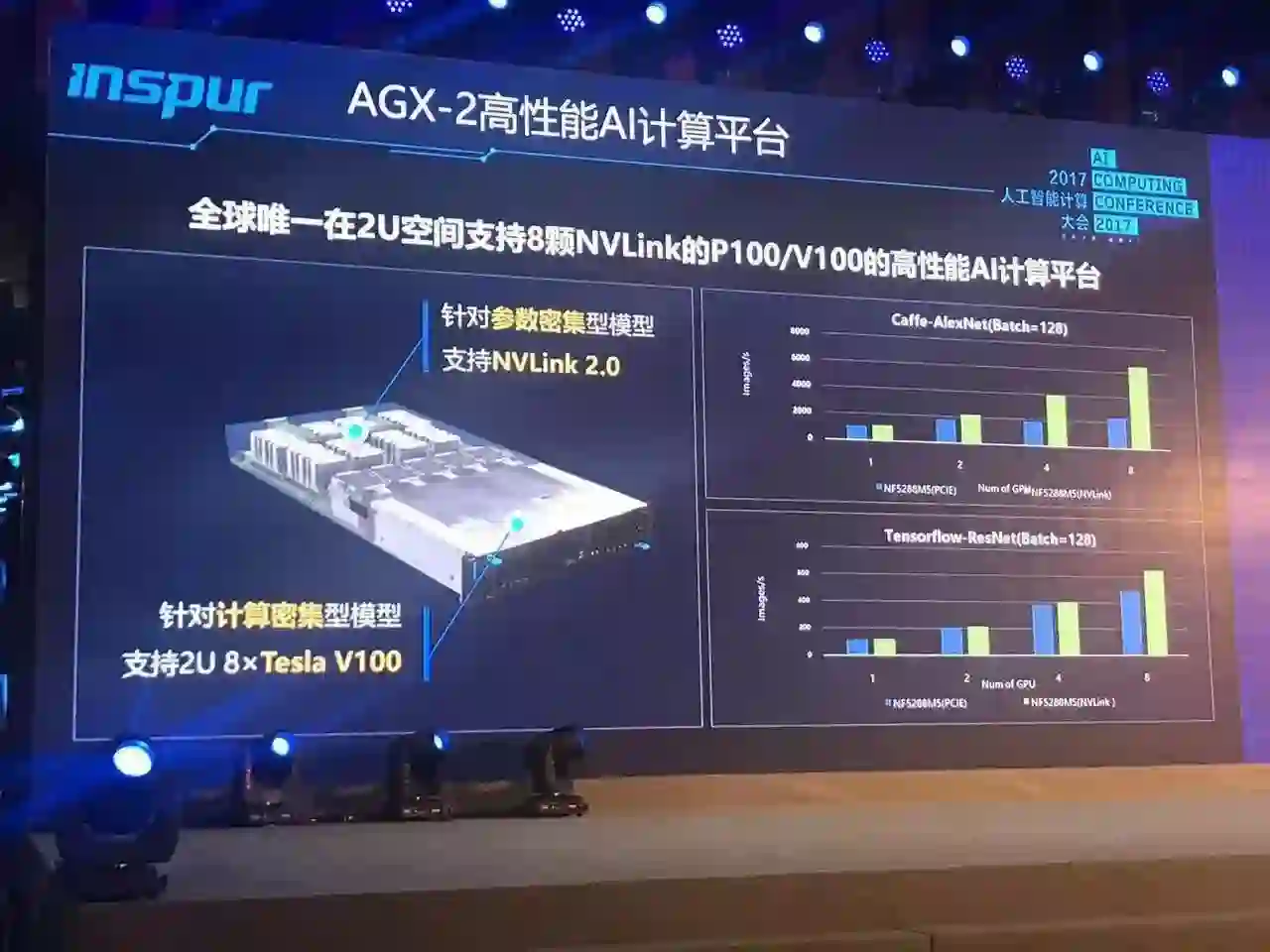 在这个基础上面向AI的应用,浪潮提供了E2E的解决方案。 在这里有高密度高性能的模型训练的平台AGX-2。胡雷钧说,它是目前世界上最高密度的AI计算平台,在2U空间之内支持NVLink,支持P100GPU,有基于FPGA的F10A加速卡,有高效的人工智能管理平台AIstation,有高性能深度学习框架Caffe-MPI,同时还有非常有经验的工程师队伍可以帮助优化算法。