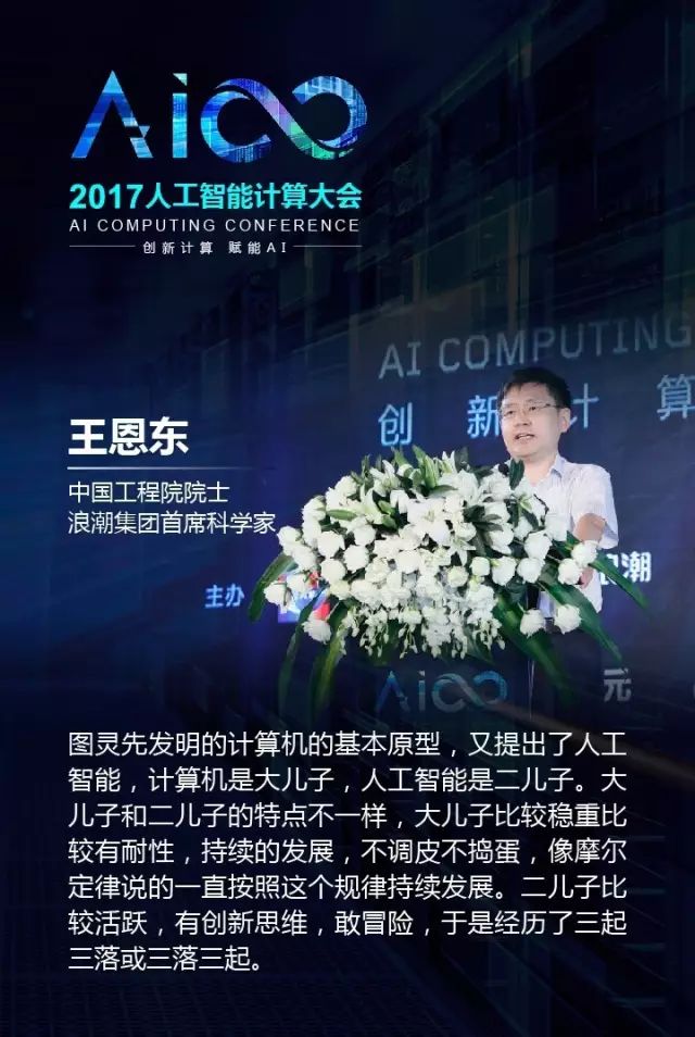 王恩东院士说,图灵先发明的计算机的基本原型,又提出了人工智能,计算机是大儿子,人工智能是二儿子。大儿子和二儿子的特点不一样,大儿子比较稳重比较有耐性,持续的发展,不调皮不捣蛋,像摩尔定律说的一直按照这个规律持续发展。二儿子比较活跃,有创新思维,敢冒险,于是经历了三起三落或三落三起。