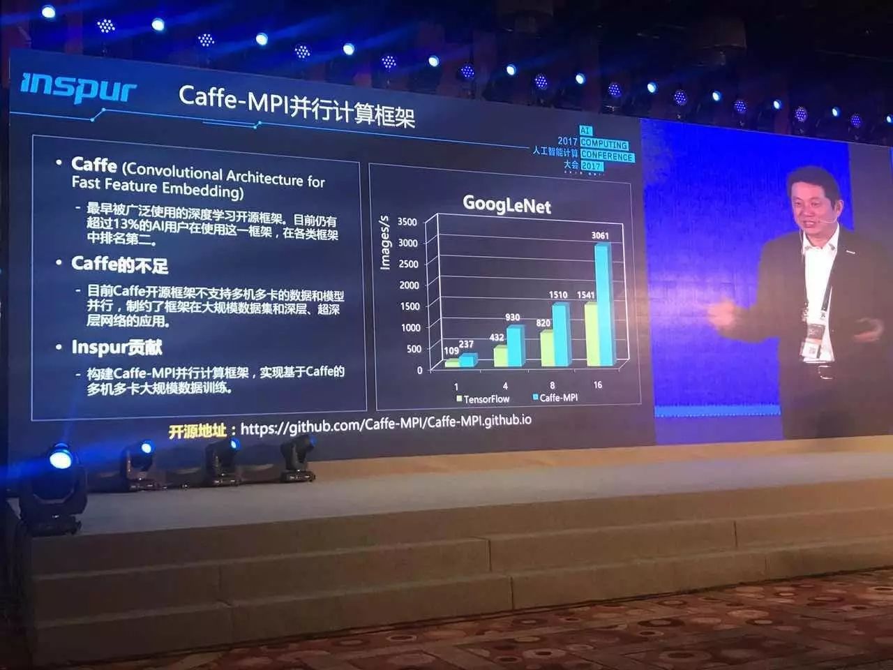 浪潮是首个把Caffe的计算模型从原先的单机版扩展成为集群版,通过这个集群版可以做到在一个系统里运行更大尺寸的神经网络,同时通过MPI的编程能够更有效的调动系统的资源来完成一个高性能计算。