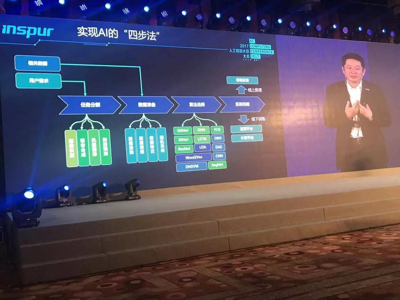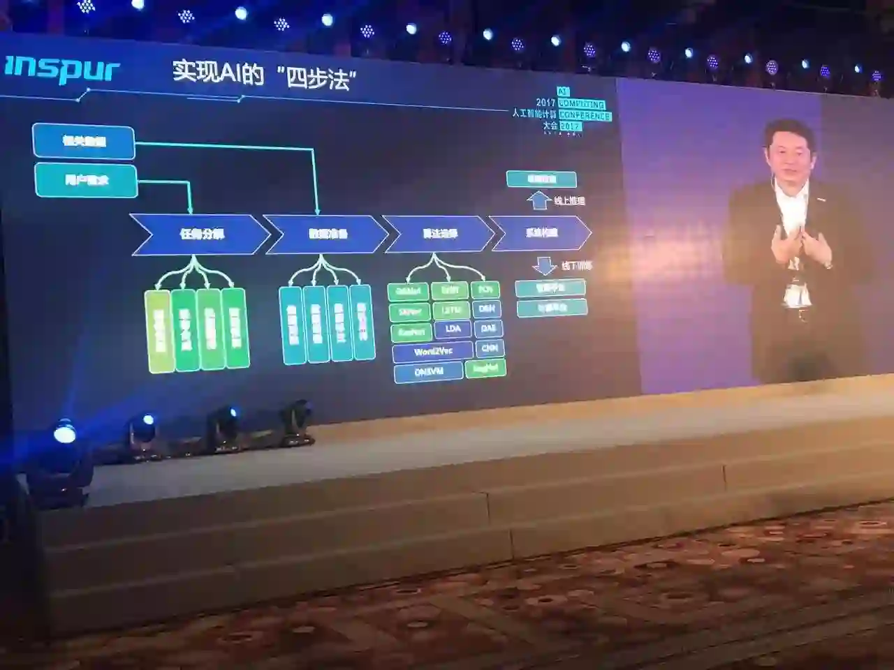要构筑一个AI系统无论它是一个训练的系统、还是它的应用系统,无论是AI模型的供应者还是训练者,都要仔细考量系统应该怎么构成。胡雷钧总结了四步法:任务分解也就是用户需求的分解;数据准备,要有大批的数据去训练,这些数据通过采集、筛选、清洗最终把它归类,把它送到AI的平台里面去;算法选择,目前针对不同的应用有不同的算法。有了算法之后还要在系统平台上做一些试验看看我们应该构建什么样的系统平台,才能让这个算法训练得更好、运行得更好;系统构造,构造这个系统的时候我们要考虑应该用什么样的计算平台,应该用什么样的管理平台,应该怎么考虑线下的训练,应该怎么考虑线上的识别。