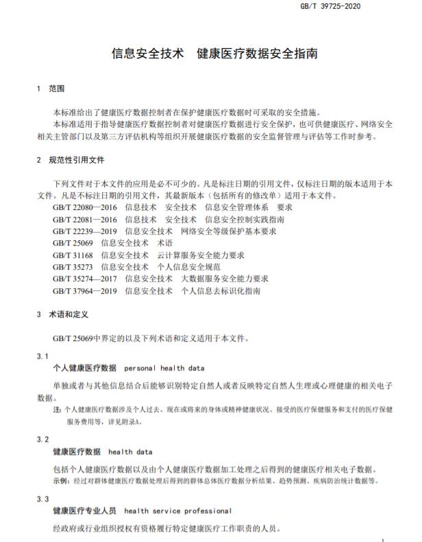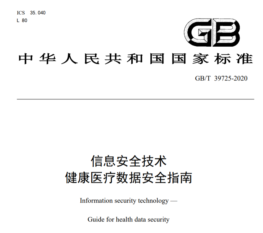 《信息安全技术健康医疗数据安全指南》国家标准,本标准给出了健康医疗数据控制者在保护健康医疗数据时可采取的安全措施。本标准适用于指导健康医疗数据控制者对健康医疗数据进行安全保护,也可供健康医疗、网络安全 相关主管部门以及第三方评估机构等组织开展健康医疗数据的安全监督管理与评估等工作时参考。