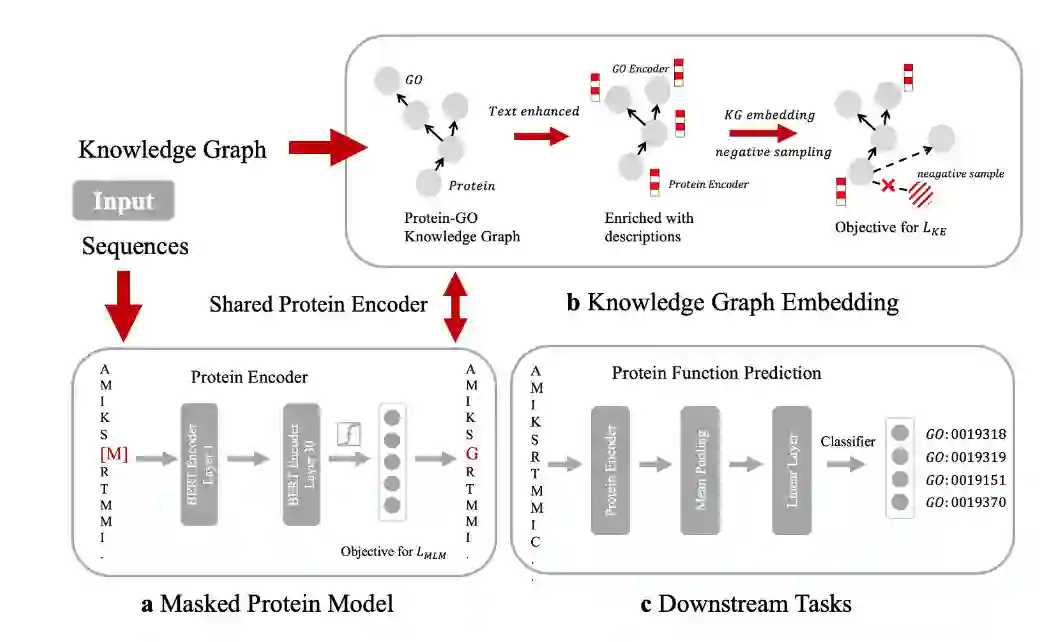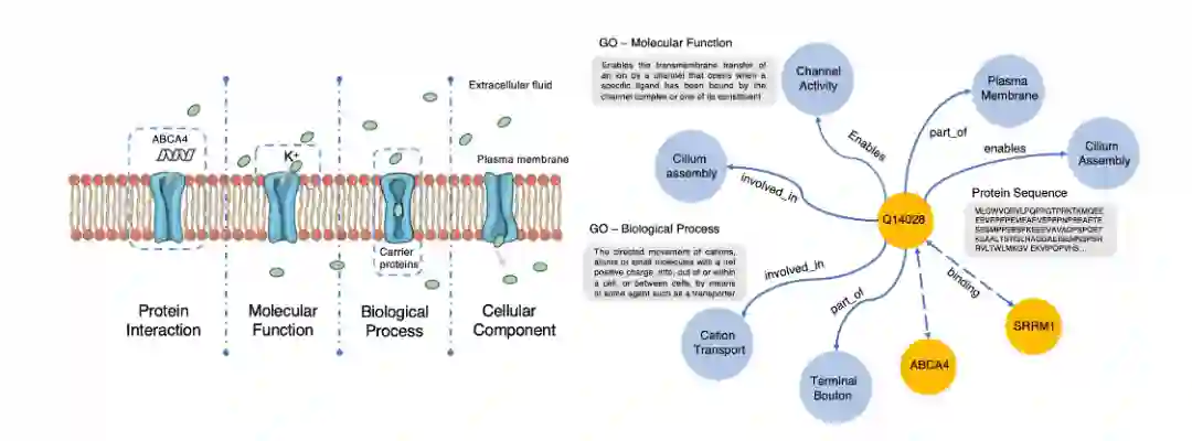 我们通过访问公开的基因本体知识图谱“Gene Ontology(简称Go)”,并将其和来自Swiss-Prot数据库的蛋白质序列对齐,来构建用于预训练的知识图谱ProteinKG25,该知识图谱包含4,990,097个三元组, 其中4,879,951个蛋白质-Go的三元组,110,146 个Go-Go三元组,并已全部开放供社区使用。如下图所示,基于“结构决定功能”的思想,如果在蛋白质预训练过程中显式地告诉模型什么样的结构具备什么样的功能,显然能够促进如蛋白质功能预测、蛋白质交互预测等任务的效果。