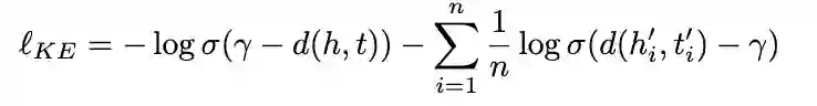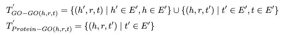 基于构建好的知识图谱,我们设计了一个特殊的蛋白质预训练模型OntoProtein。注意到在预训练输入中包含两种不同的序列:蛋白质序列和描述蛋白质功能、生物过程等的文本描述信息。因此,我们采取两路不同的编码器。对蛋白质序列我们采用已有的蛋白质预训练模型ProtBert进行编码,对文本序列我们采用BERT进行编码。为了更好地进行预训练和融合三元组知识信息,我们采用了两个优化目标。首先是传统的掩码语言模型目标,我们通过随机Mask序列中的一个Token并预测该Token。其次是三元组知识增强目标,我们通过类似知识图谱嵌入学习的方式来植入生物学三元组知识,如下公式所示: