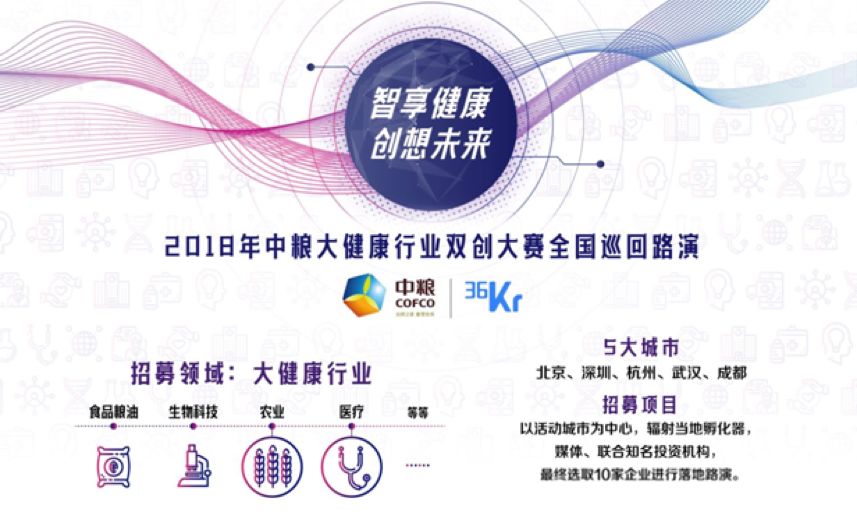 中粮双创基地于2017年年底找到了36氪创新部,希望借助36氪在创投圈的影响力一起发掘大健康行业下优秀的初创企业。经过近半年时间的筹备,中粮与36氪将前往5大城市寻找大健康领域的新一批独角兽。