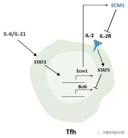 该研究发现ECM1缺失小鼠表现出TFH细胞分化、生发中心形成和抗原特异性抗体分泌的显著降低;相反,给野生型小鼠体内注入过量的重组ECM1蛋白会增强TFH细胞分化和生发中心反应;给流感感染小鼠注射重组ECM1蛋白会增强TFH细胞分化,促进流感特异性中和性抗体的分泌;进一步机制研究发现ECM1通过阻断IL-2-STAT5信号通路来抑制Blimp1的表达,同时促进Bcl6的表达,从而调控TFH细胞的分化;此项成果揭示出ECM1蛋白可以正性调控TFH细胞的分化和抗体生成,有重要的科学意义和潜在的应用价值。
