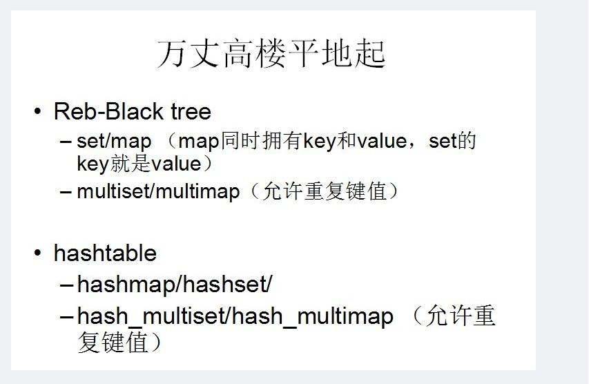 关联式容器。关联式容器又分为set(集合)和map(映射表)两大类,以及这两大类的衍生体multiset(多键集合)和multimap(多键映射表),这些容器均以RB-tree完成。此外,还有第3类关联式容器,如hashtable(散列表),以及以hashtable为底层机制完成的hash_set(散列集合)/hash_map(散列映射表)/hash_multiset(散列多键集合)/hash_multimap(散列多键映射表)。也就是说,set/map/multiset/multimap都内含一个RB-tree,而hash_set/hash_map/hash_multiset/hash_multimap都内含一个hashtable。