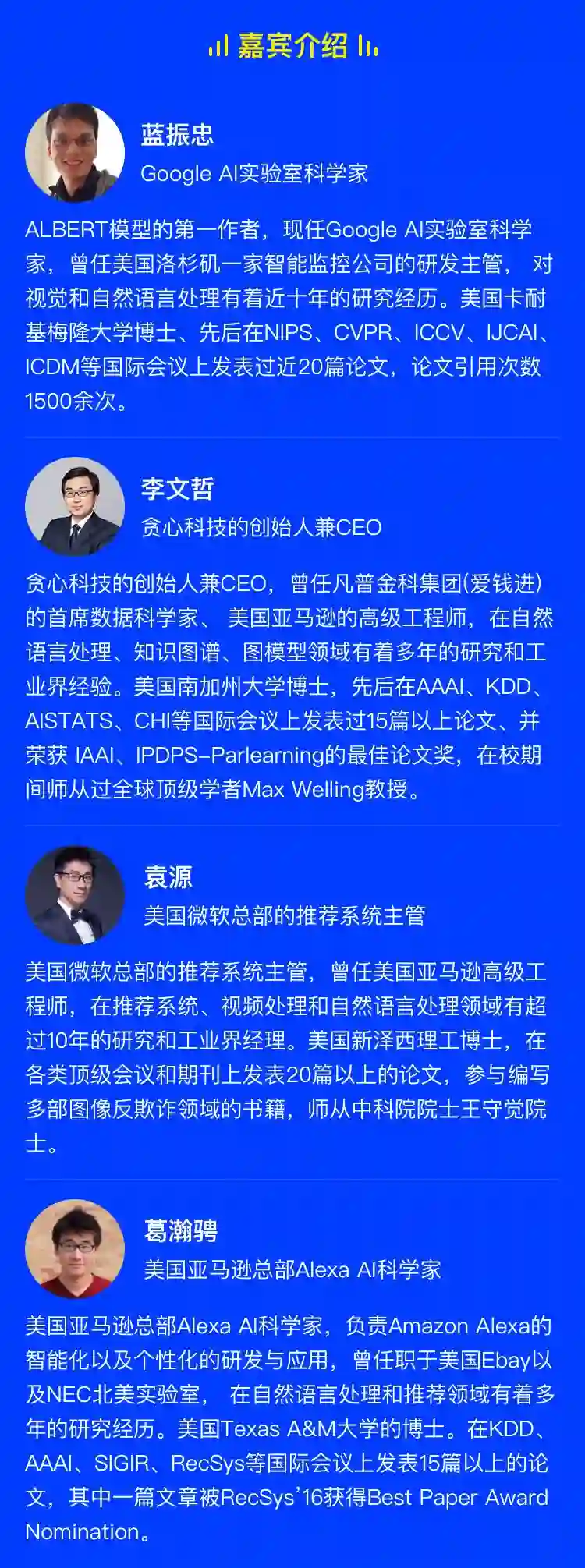 本次专题活动除了贪心科技的创始人,我们还联合了国内外多位NLP领域专家,包括蓝振忠(ALBERT模型第一作者,Google Lab科学家,卡耐基梅隆大学博士),葛瀚骋(Amazon Alexa部门科学家,Texas A&M大学博士), 袁源(美国微软推荐系统主管,新泽西理工博士)。