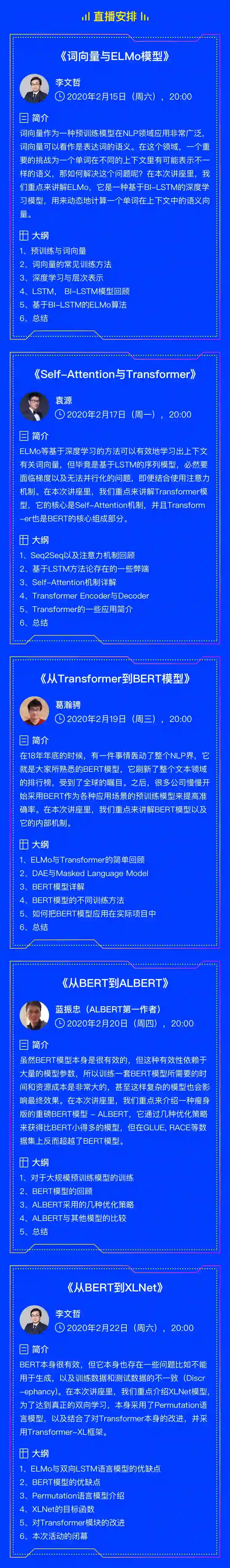 本次的专题课程,我们也有幸邀请到了多位国内外NLP领域的专家,其中蓝振忠博士作为ALBERT模型的第一作者,会亲自讲述当初对这份工作背后的思考以及技术细节。 希望通过本次活动,给大家带来一些认知上的收获,在疫情期间也可以充实自我,武汉加油,中国加油!