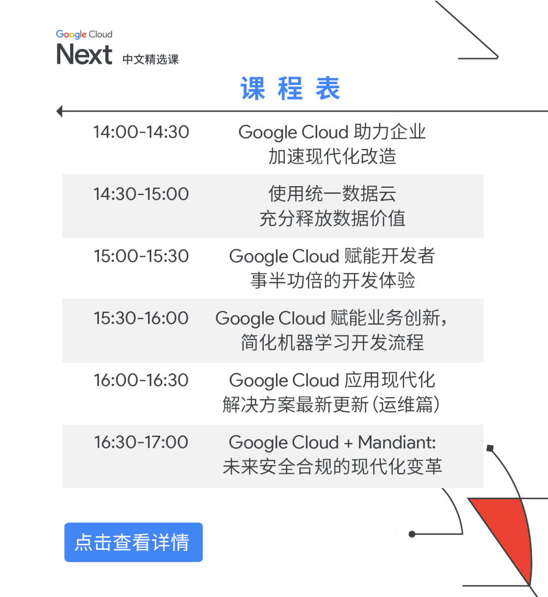 自今日,迎未来!今年的 Next 大会上 Google Cloud 推出多达 123 项新发布,覆盖前沿技术、产品战略与应用实践多个领域。想快速深入了解这些 Google Cloud 最新产品与工具,重塑开发体验,赋能出海创新?Next '22 中文精选课来啦!11 月 8 日,Google Cloud 将精选大会在应用现代化、云原生、数据云、AI 和机器学习、DevOps 及安全合规等领域的前沿技术发布,带您全面解读!
