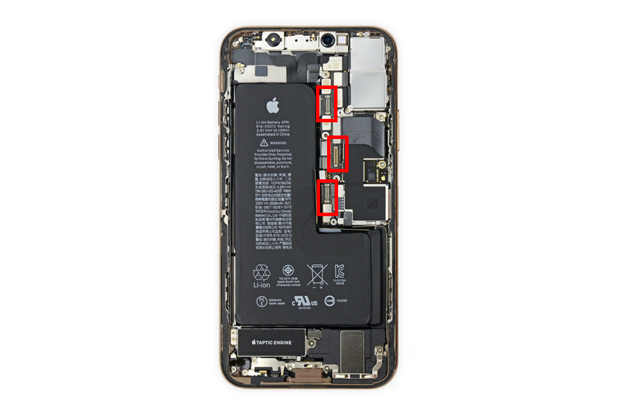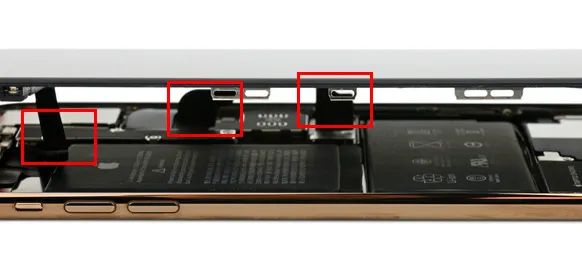 将手机底部的两颗螺丝拧出来之后,先用热风筒开最大档热风沿着屏幕四周吹一下,把屏幕封胶给吹软化了,方便后续的拆机。吹到手机差不多发烫的时候,就可以上吸盘了,用吸盘吸住屏幕底部和背部,缓慢小心地将屏幕底部吸开一条缝,然后把拆机片卡进去,就可以拿下吸盘了。建议新手使用双面吸盘,更易于我们操作。接着用拆机片沿着屏幕边缘划开封胶,注意拆机片不要插入太深,特别是划开到屏幕右边的时候,iPhone XS 的屏幕排线在屏幕的右边(上图红框位置)。两侧的封胶划开之后,把屏幕向右侧翻转,就能打开屏幕了。