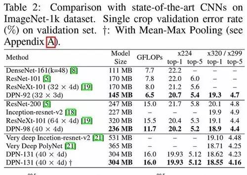 作者分别在“图像分类”,“物体检测”和“物体分割”三大任务上对 DPN 进行了验证。在 ImageNet 1000 类分类任务中的性能如表 2 所示: