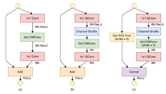 基于分组逐点卷积和通道重排操作,作者提出了全新的ShuffleNet结构单元,如图2所示。该结构继承了“残差网络”(ResNet)[3]的设计思想,在此基础上做出了一系列改进来提升模型的效率:首先,使用逐通道卷积替换原有的3x3卷积,降低卷积操作抽取空间特征的复杂度,如图2(a)所示;接着,将原先结构中前后两个1x1逐点卷积分组化,并在两层之间添加通道重排操作,进一步降低卷积运算的跨通道计算量。最终的结构单元如图2(b)所示。类似地,文中还提出了另一种结构单元(图2(c)),专门用于特征图的降采样。