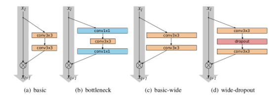 上图中 a,b 是何恺明等人提出的两种方法,b 计算更节省,但是 WDN 的作者想看宽度的影响,所以采用了 a。作者提出增加 residual block 的 3 种简单途径: