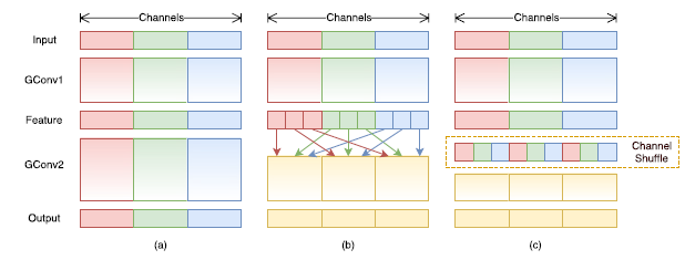 因此,在使用分组逐点卷积的同时,需要引入组间信息交换的机制。也就是说,对于第二层卷积而言,每个卷积核需要同时接收各组的特征作为输入,如图 1(b)所示。作者指出,通过引入“通道重排”(channel shuffle,见图 1(c))可以很方便地实现这一机制;并且由于通道重排操作是可导的,因此可以嵌在网络结构中实现端到端的学习。