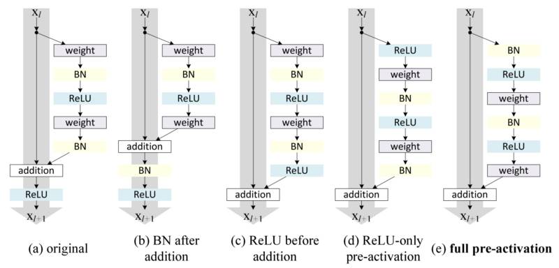 按照这种直觉,前述《用于图像识别的深度残差学习》[2]的作者改进了残差块,并提出一个残差预激活变体[7],其中梯度可以畅通无阻地通过 shortcut 连接到任何其他先前的层。实际上,这一研究表明,使用原始的残差块,训练一个 1202 层的 ResNet 比 110 层的 ResNet 性能更差。