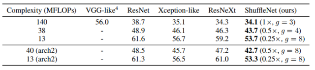 作者使用一样的整体网络布局,在保持计算复杂度的同时将 ShuffleNet 结构单元分别替换为 VGG-like、ResNet、Xception-like 和 ResNeXt 中的结构单元,使用完全一样训练方法。表2中的结果显示在不同的计算复杂度下,ShuffleNet 始终大大优于其他网络。