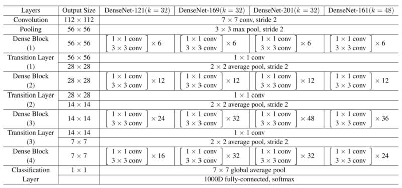 遵循这个范式,我们知道第 l 层将具有 k *(l-1)+ k_0 个输入特征映射,其中 k_0 是输入图像中的通道数。作者使用一个名为增长率(k)的超参数来防止网络的生长过宽,以及使用一个 1x1 的卷积瓶颈层来减少昂贵的 3x3 卷积之前的特征映射数量。整体结构如下表所示: