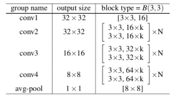 WRN 结构如上,作者表示,小的滤波器更加高效,所以不准备使用超过 3x3 的卷积核,提出了宽度放大倍数 k 和卷积层数 l。