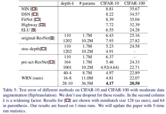 WRN 40-4 与 ResNet-1001 结果相似,参数数量相似,但是前者训练快 8 倍。作者总结认为: