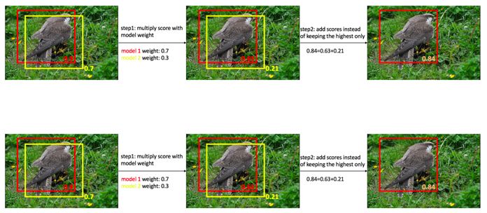 合并从所有模型得到的预测框并使用NMS,此外,除此之外,研究人员采用不同模型的分数叠加的方式代替只保留最高分模型,在这个步骤中IOU阈值为0.5。