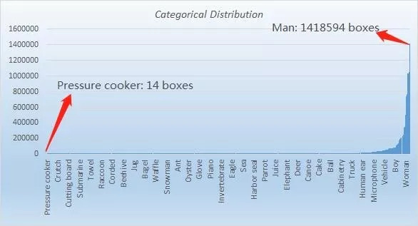 数据分布不均衡:最少的类别框选只有14个,而最多的类别框选超过了140w,数据分布严重不均衡。