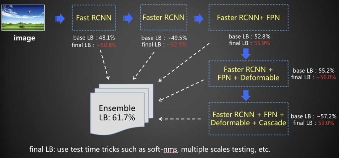 简言之,在Fast R-CNN框架下,该团队采用了不同的骨架网络进行训练,而在Faster R-CNN框架下只使用了ResNet101这种骨架网络进行训练。在训练过程中,还通过不同的策略有效解决了各种技术问题。详情如下: