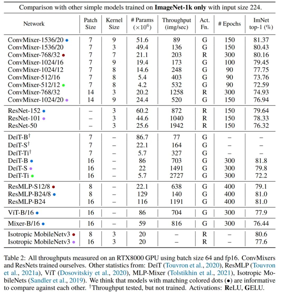 但是,ConvMixers 的推理速度较竞品模型慢得多,这可能因为它们的 patch 更小。超参数调整和优化可以缩小这一差距,具体参见下表 2: