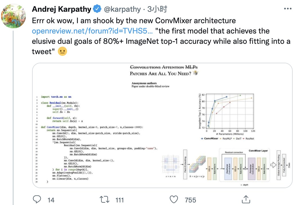 特斯拉 AI 高级总监 Andrej Karpathy 在其个人社交网站推特上感叹道:我被新的 ConvMixer 架构震撼了。