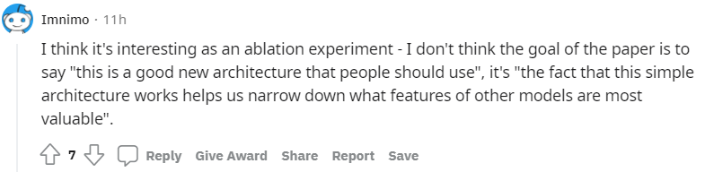 还有网友表示:「作为消融实验,我认为很有趣。我不认为这篇论文的目的是表达『 ConvMixer 是一个好的架构,值得研究者使用』,而是『这个简单的架构有效的帮助我们缩小了其他模型最有价值的特性范围』。」