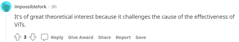 有网友认为:「这项研究具有很重要的理论意义,因为它挑战了 ViT 有效性的原因。」