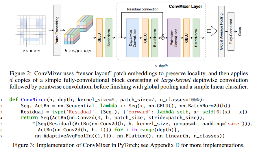 在 ConvMixer 块的多次应用之后,执行全局池化以获得大小为 h 的特征向量,并将其传递给 softmax 分类器。