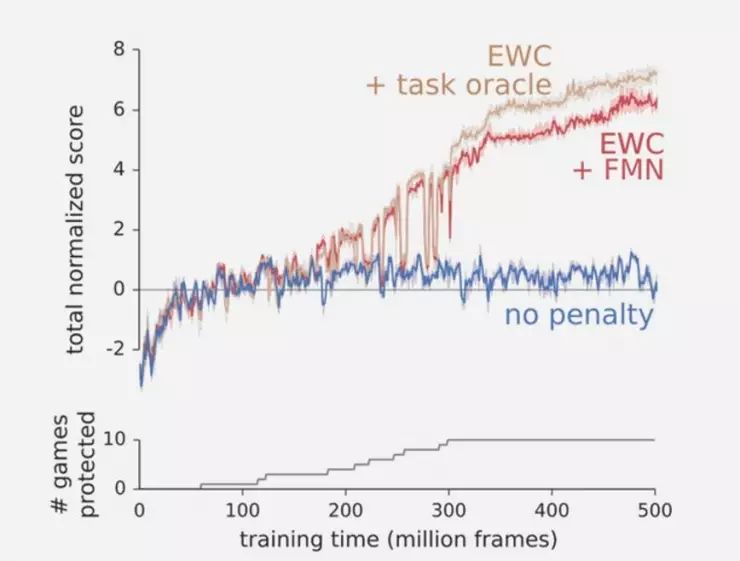 为了测试该算法,DeepMind 让程序不断尝试玩 Atari 游戏。据AI科技评论了解,单单从得分来学习一个游戏是一项具有挑战性的任务,但是依次学习多个游戏则更加困难,因为每个游戏需要单独的战略。如下图所示,如果没有 EWC 算法,程序会在游戏停止后快速将之前的事忘得一干二净(蓝色),这就意味着其实程序什么游戏都没学会。不过,如果用上 EWC 算法(棕色和红色),程序就不那么容易遗忘,且可以逐个学会多个游戏。