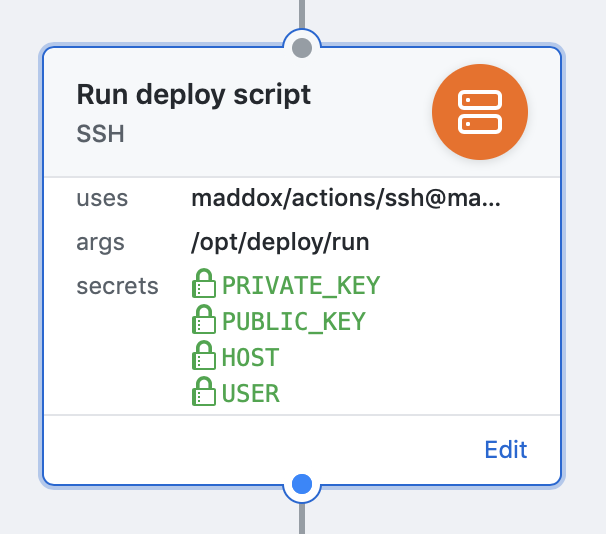 action "Run deploy script" {uses = "maddox/actions/ssh@master"args = "/opt/deploy/run"secrets = ["PRIVATE_KEY","HOST","USER"]}